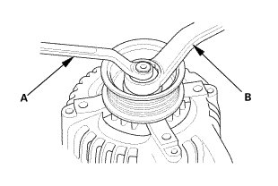 1. If the front bearing needs replacing, remove the pulley locknut with a 10 mm wrench (A) and a 22 mm wrench (B). If necessary, use an impact wrench.