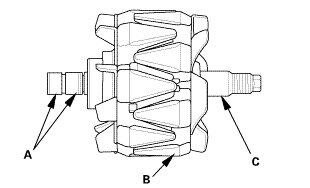 2. Check for continuity between each slip ring (A) and the rotor (B) and the rotor shaft (C).