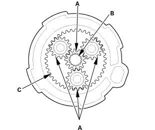 1. Check the planetary gears (A), the armature shaft gear (B), and the internal ring gear (C). Replace them if they are worn or damaged.