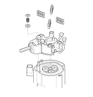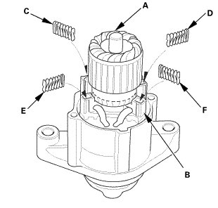 2. While squeezing a spring (C), insert it in the hole on the brush holder, and push it until it bottoms. Repeat this for the other three springs (D, E, and F).