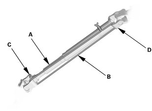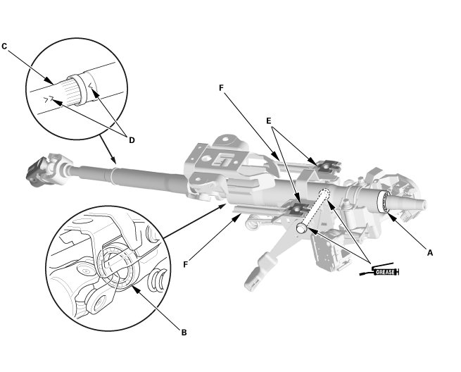 * Check the splined shaft (C) for smooth movement in and out. If the splined shaft is removed, slip it into the splined tube by aligning the paint or stamped marks (D). If it sticks or binds, replace the steering column as an assembly.