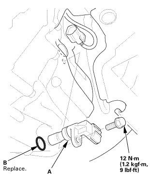 1. Install the output shaft (countershaft) speed sensor (A) with a new O-ring (B).