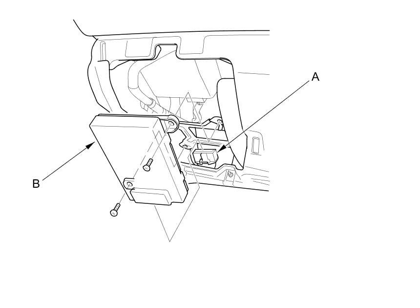 2. Remove the mounting screws, then disconnect the connector (A) from the HandsFreeLink control unit (B) and remove it.