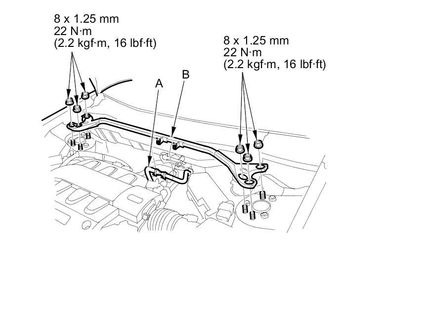 1. Disconnect the brake booster vacuum hose (A) from the strut brace (B).
