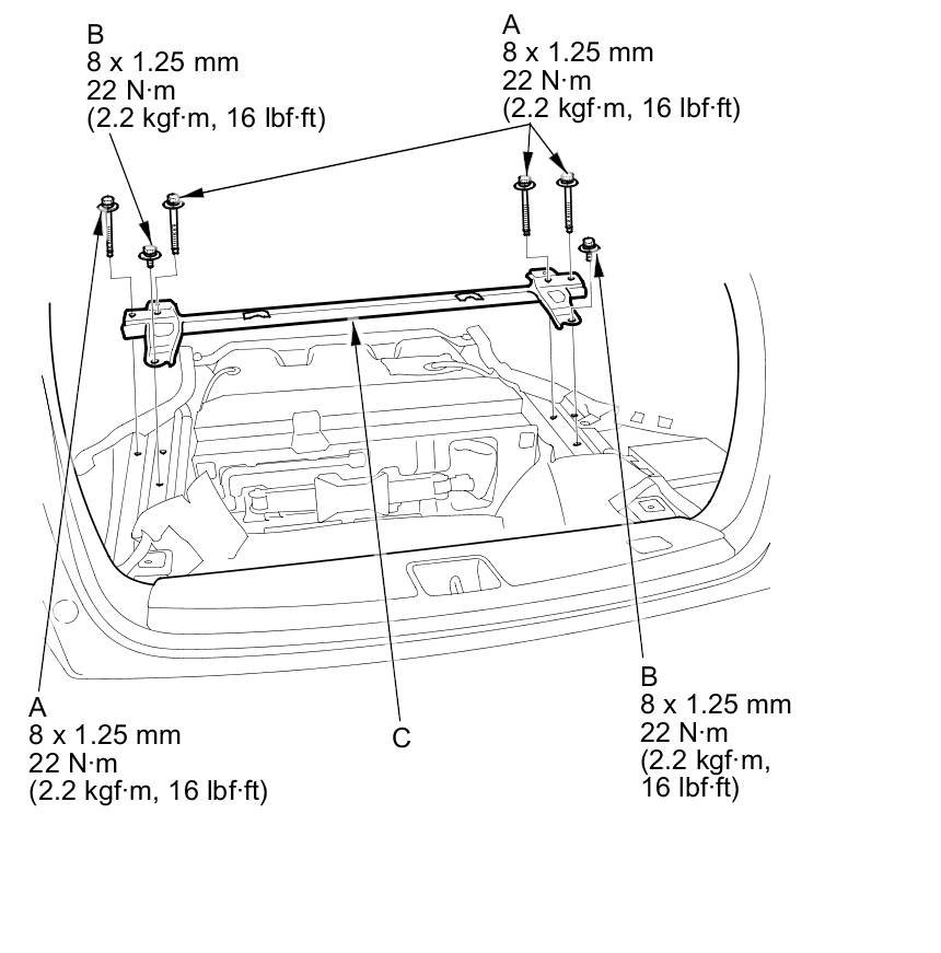 2. Remove the bolts (A, B) securing the rear cargo support (C), then remove the support.
