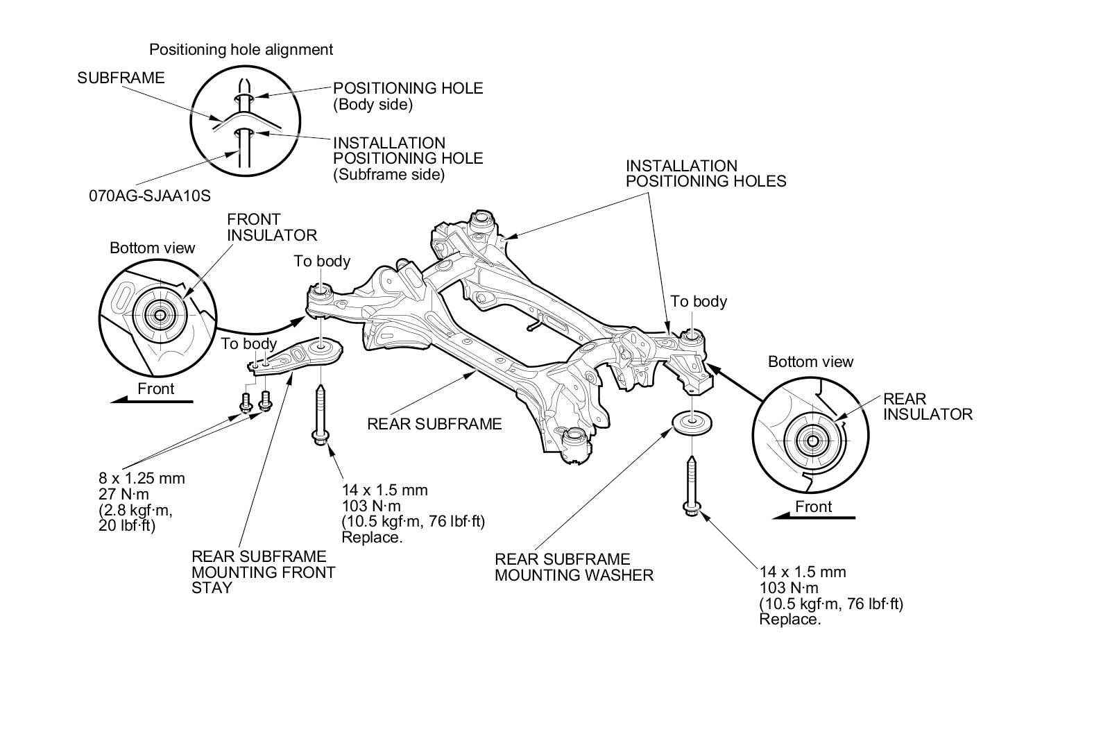 5. Tighten the subframe mounting bolts to the specified torque values starting with the right rear subframe mounting bolt. Use the subframe alignment pin when tightening the rear side subframe mounting bolts.