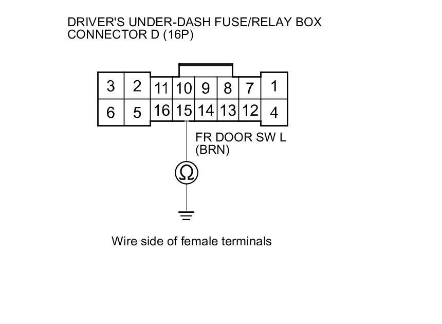 8. Check for continuity between driver's under-dash fuse/relay box connector D (16P) terminal No. 15 and body ground.