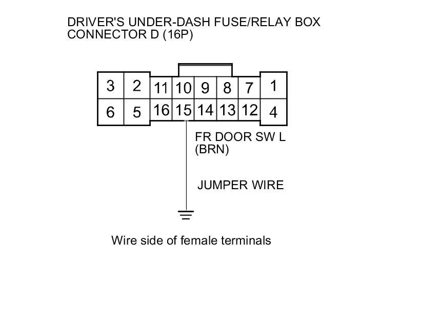12. Connect driver's under-dash fuse/relay box connector D (16P) terminal No. 15 and body ground with a jumper wire.