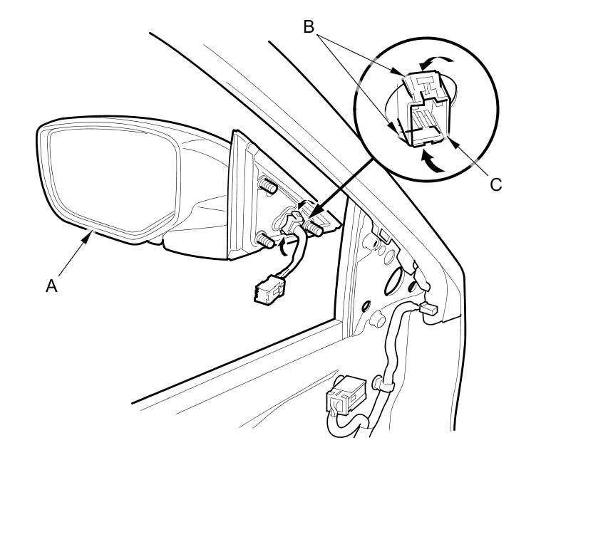 4. While holding the power mirror (A), squeeze the retaining tabs (B) on the connector clip (C), then push out to remove the power mirror.
