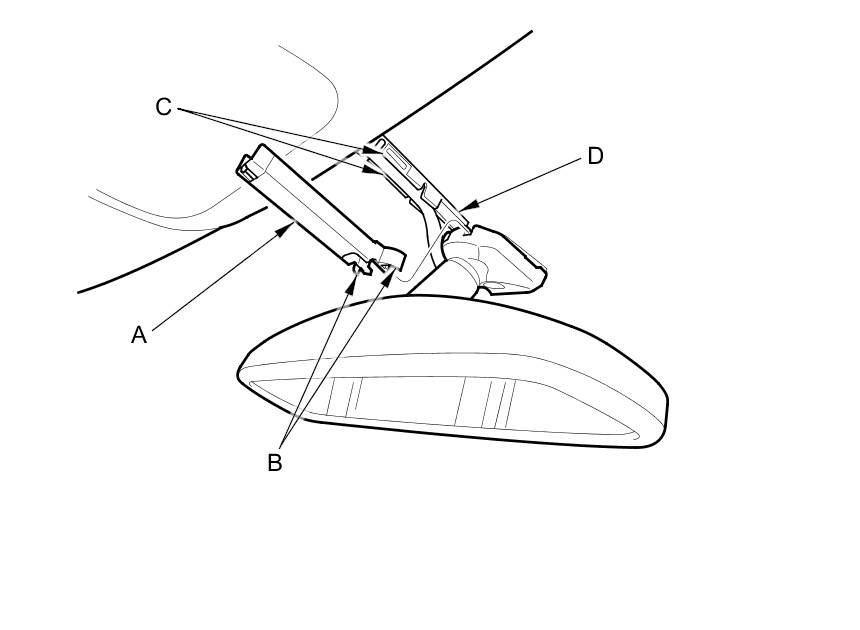 3. Release the cover from the hooks (C) of the rearview mirror harness cover base (D).