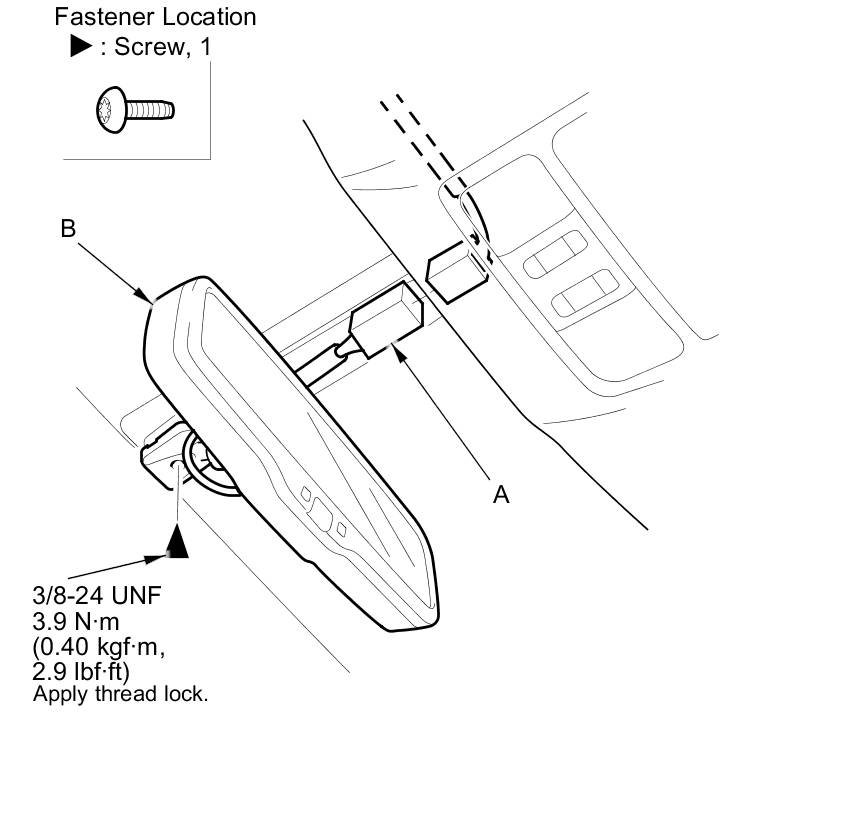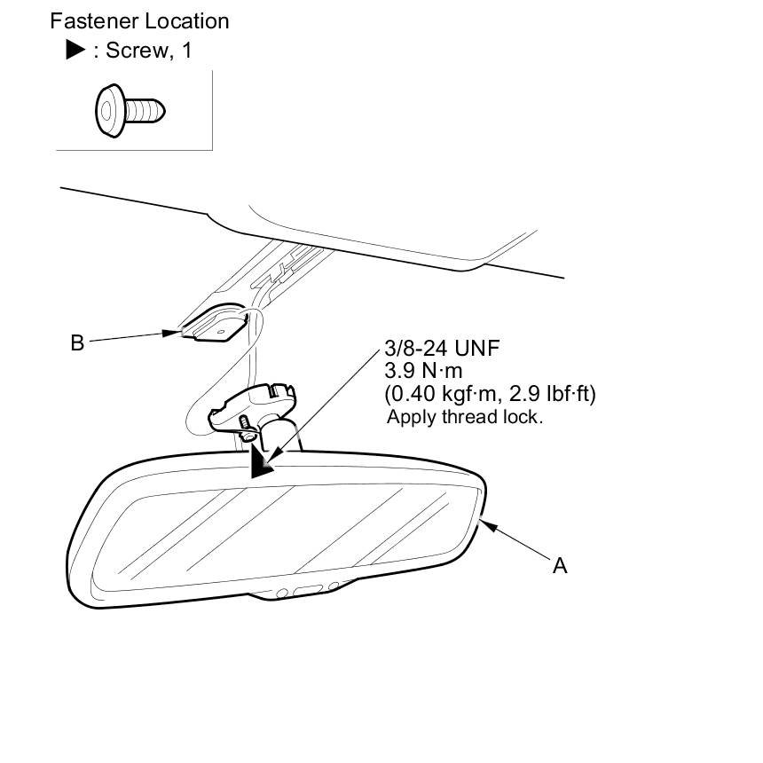 3. Loosen the screw with a TORX T20 bit, then slide the rearview mirror (A) rearward and off the mount (B).