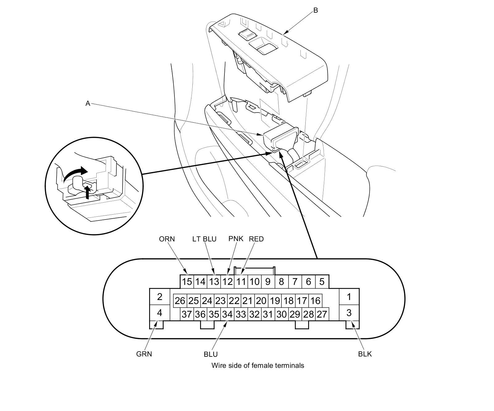 3. Disconnect the 37P connector (A) from the front passenger's power window switch (B).