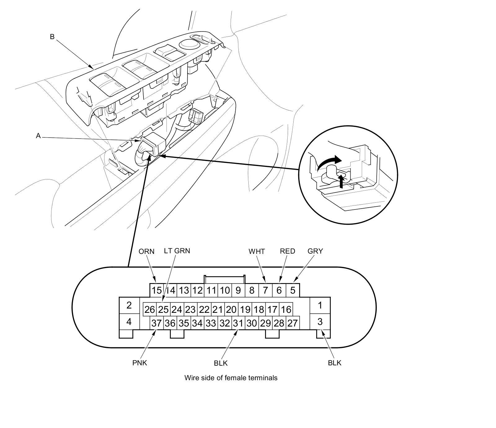 3. Disconnect the 37P connector (A) from the power window master switch (B).