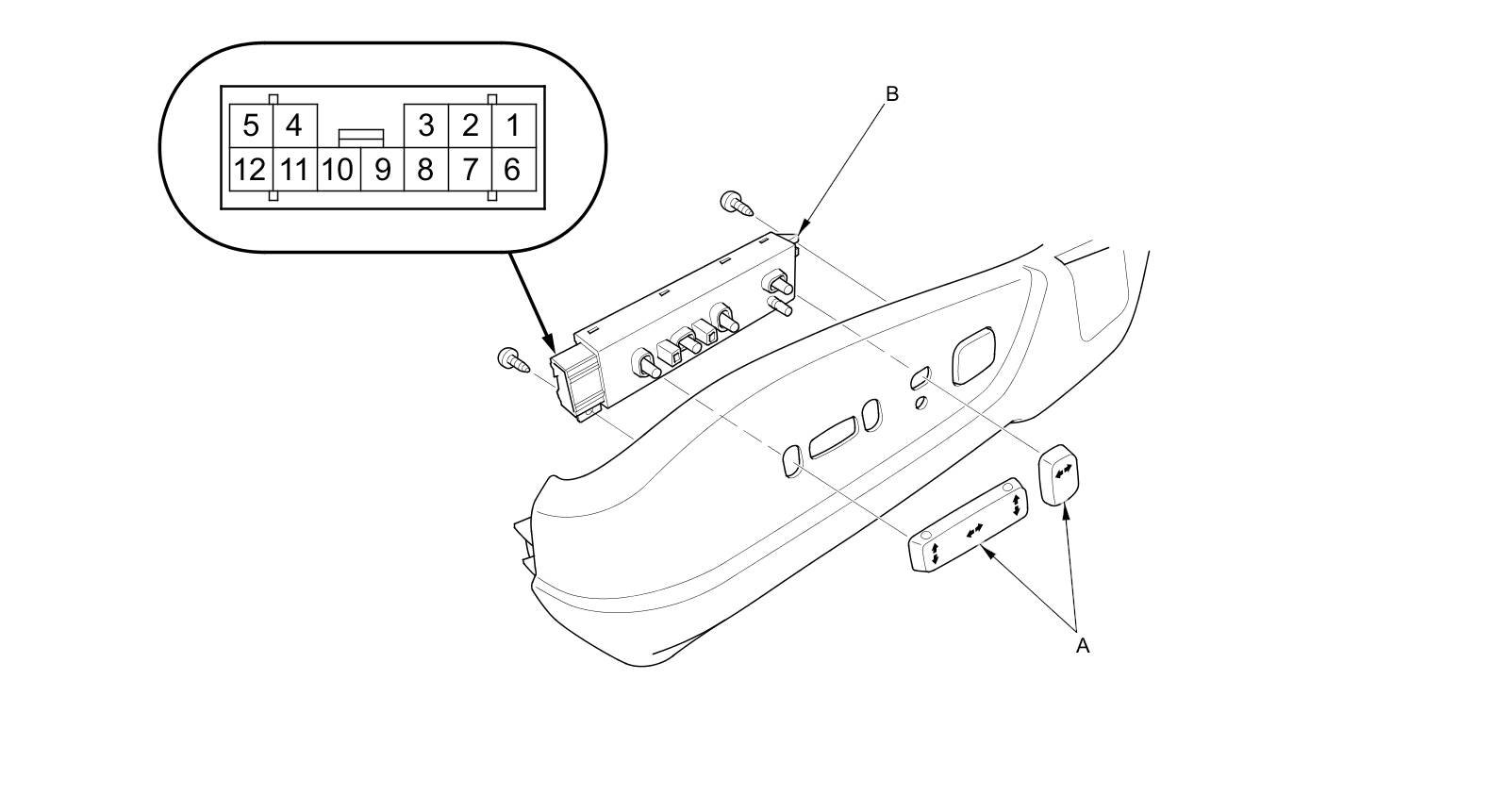 2. Remove the power seat adjustment switch knobs (A) and the recline cover from the driver's seat Front Seat Cushion Cover Replacement, then remove the two screws and the power seat adjustment switch (B).