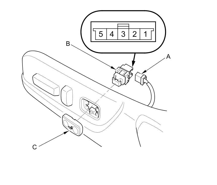 3. Disconnect the 5P connector (A) from the lumbar support switch (B).