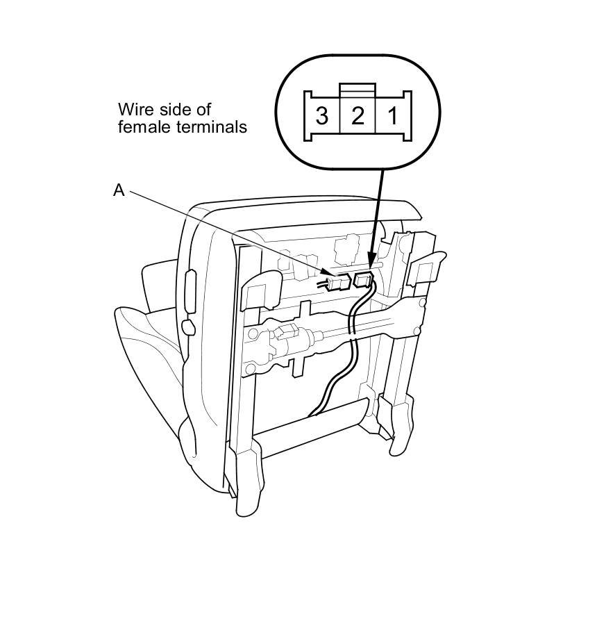 7. Check for continuity between seat heater connector A (4P) terminals No. 2 and No. 3, and terminals No. 2 and No. 1. There should be continuity.