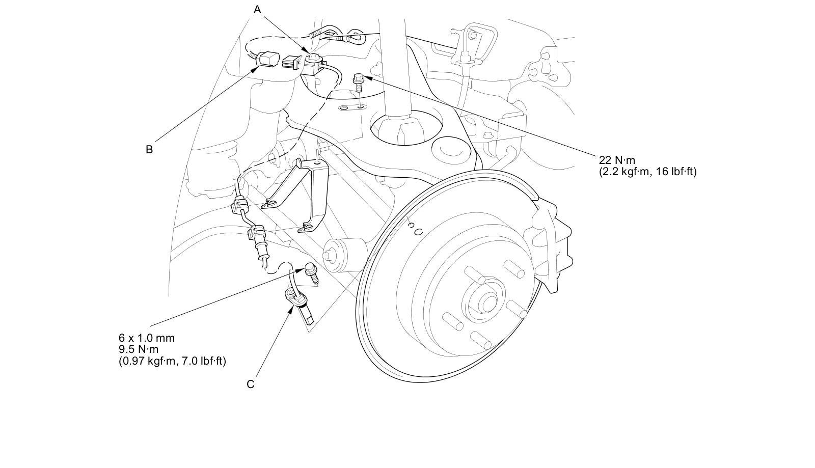 3. Remove the clamps, the bolt, and the wheel speed sensor (C).