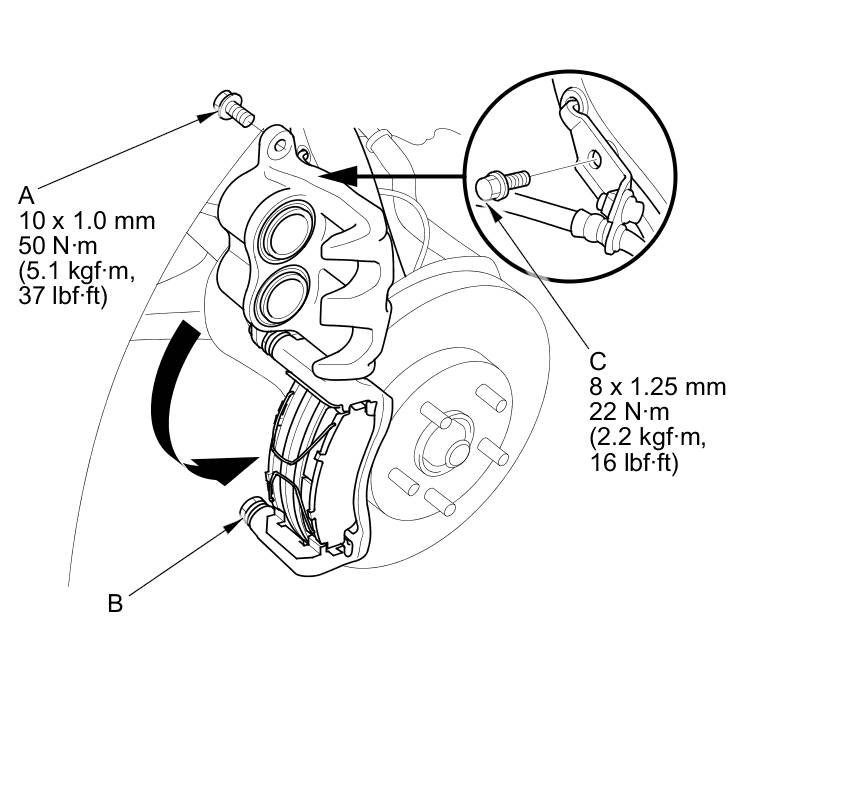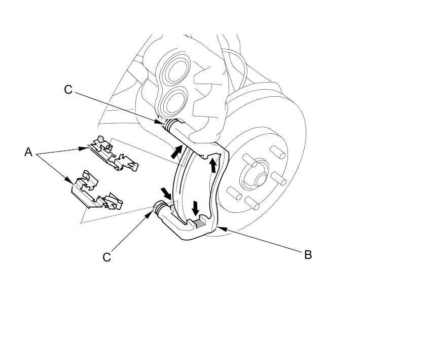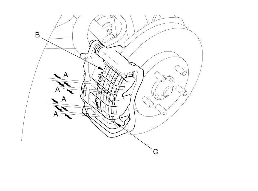 Verify that the caliper pins (C) move in and out smoothly. Clean and lube if needed.