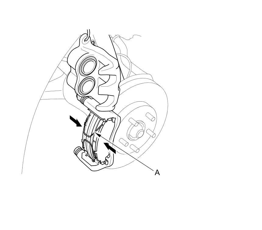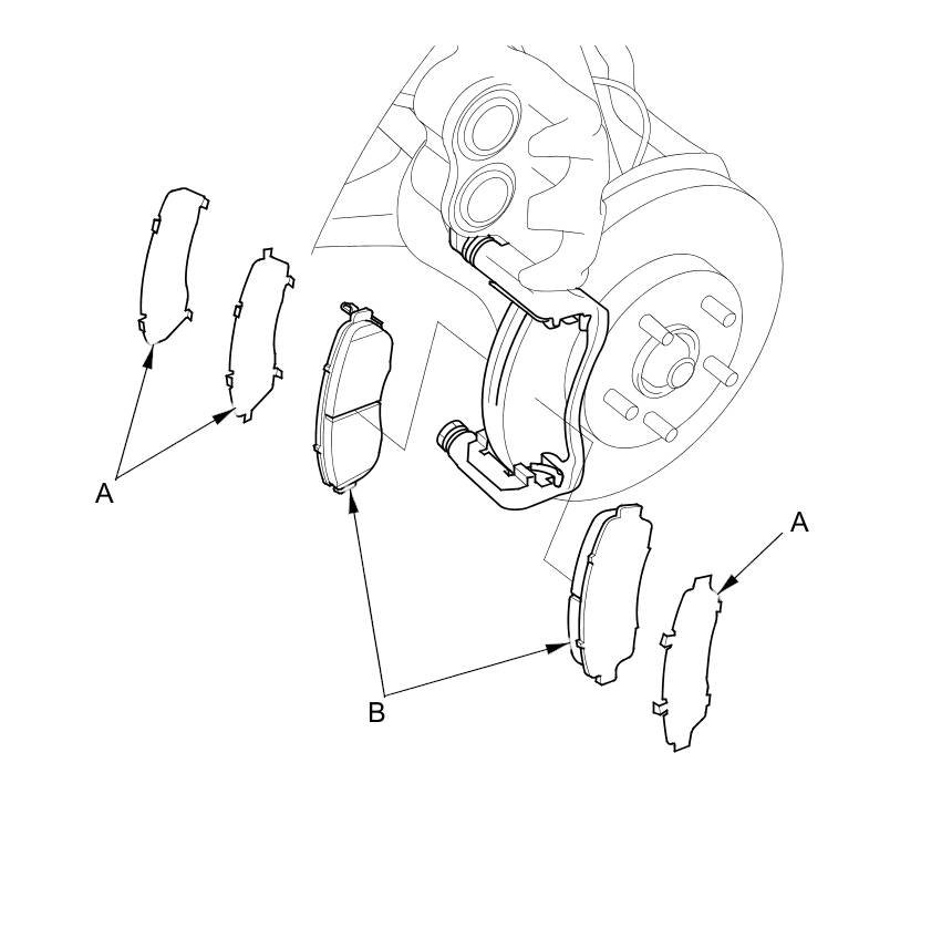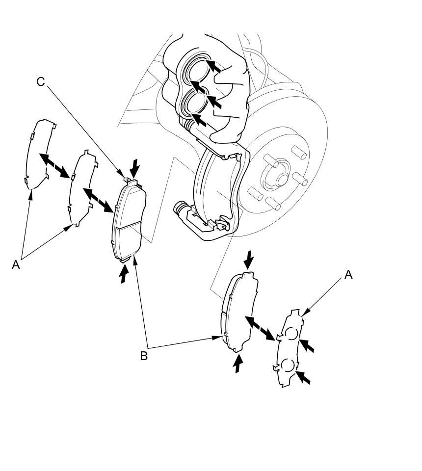 3. Check the thickness (A) of the inner pad (B) and the outer pad (C). Do not include the thickness of the backing plate.