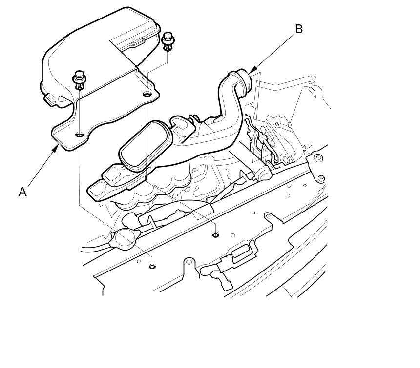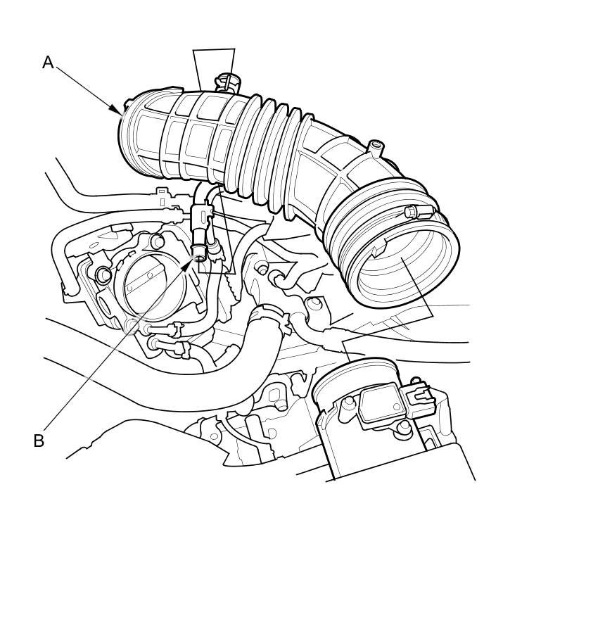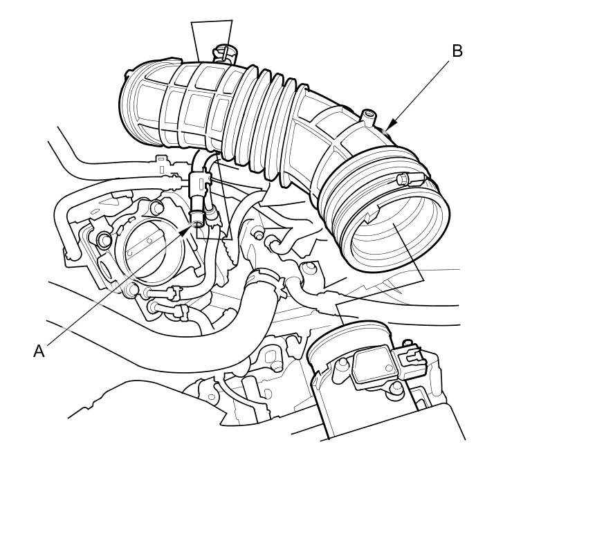 6. Disconnect the breather pipe (A), then remove the intake air duct (B).