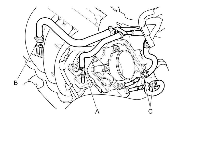 6. Connect the EVAP canister hose (B) and the brake booster vacuum hose (C).