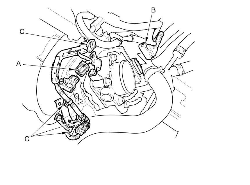9. Disconnect the MAP sensor connector (A) and the throttle body connector (B), then remove the wire harness clamps (C).