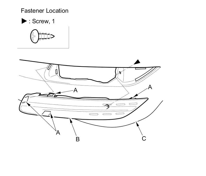 2. Remove the screw, and release the hooks (A), then remove the front bumper fog light cover (B) from the front bumper (C).