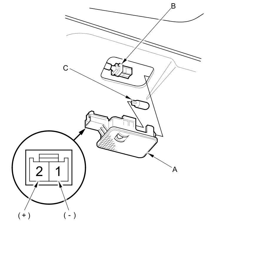 6. If the continuity is not as specified, check the bulb (C). If the bulb is OK, replace the cargo area light.