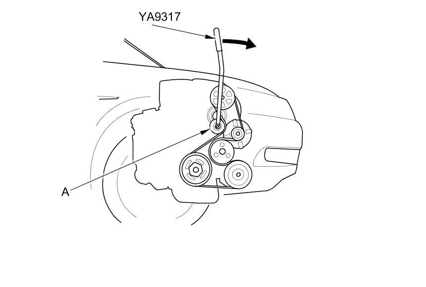 1. Move the auto-tensioner (A) using the belt tension release tool (YA9317) in the direction of the arrow to relieve tension from the drive belt, then remove the drive belt.