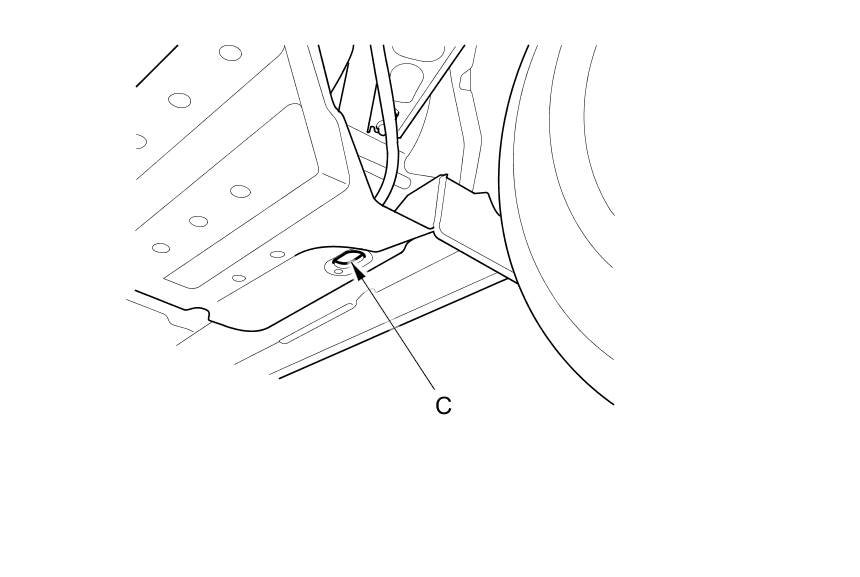 To accommodate the flat-bed tow truck equipment, the vehicle is equipped with front towing hooks (A), front tie down hook slots (B), and rear tie down hook slots (C).