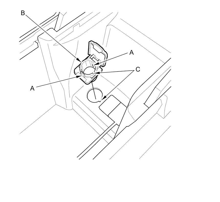9. Gently press the tabs (A), then remove the housing (B) from the panel. Note the location of the indexing tabs (C).
