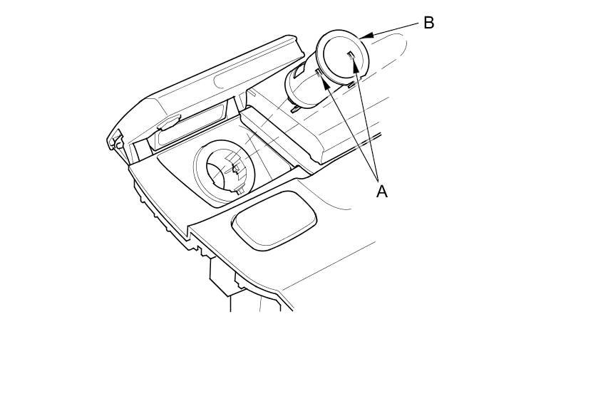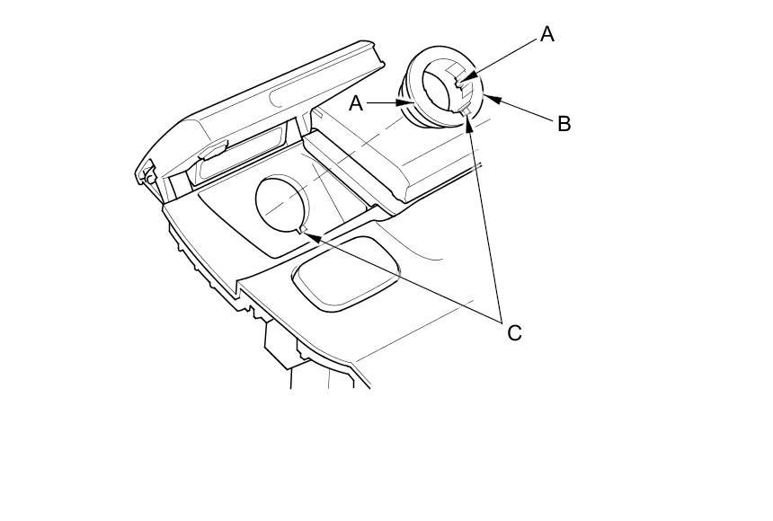 9. Gently press the tabs (A), then remove the housing (B) from the panel. Note the location of the indexing tabs (C).