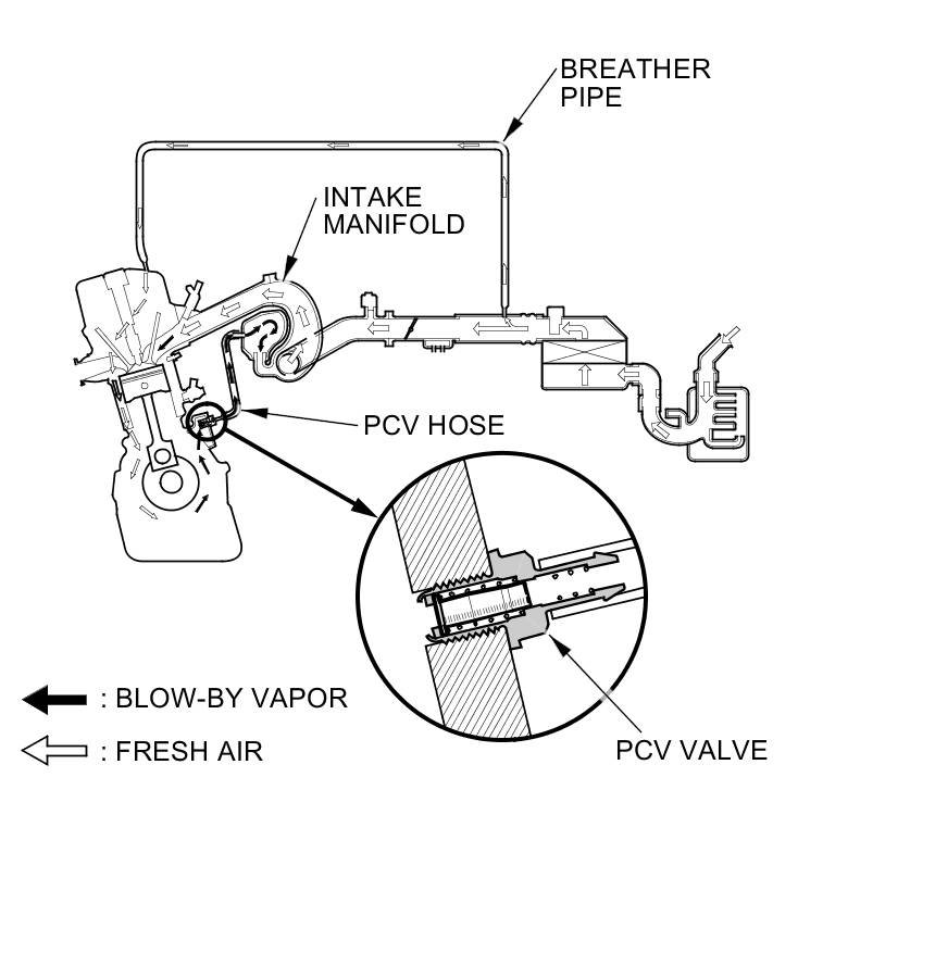 The PCV valve prevents blow-by gasses from escaping into the atmosphere by venting them into the intake manifold.