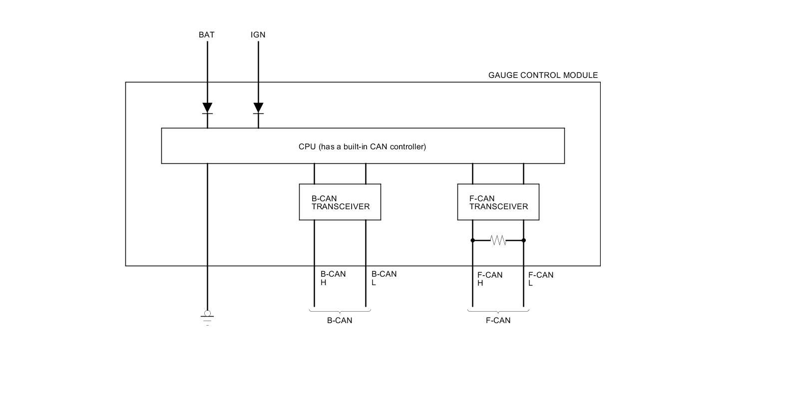 The body controller area network (B-CAN) and the fast controller area network (F-CAN) share information between multiple electronic control units (ECUs). B-CAN communication moves at a slower speed (125 kbps) for convenience related items and for other functions. F-CAN information moves at a faster speed (500 kbps) for "real time" functions such as fuel and emissions data. To allow both systems to share information, the gauge control module translates and relays the information from B-CAN to F-CAN and from F-CAN to B-CAN. This is called the Gateway Function.