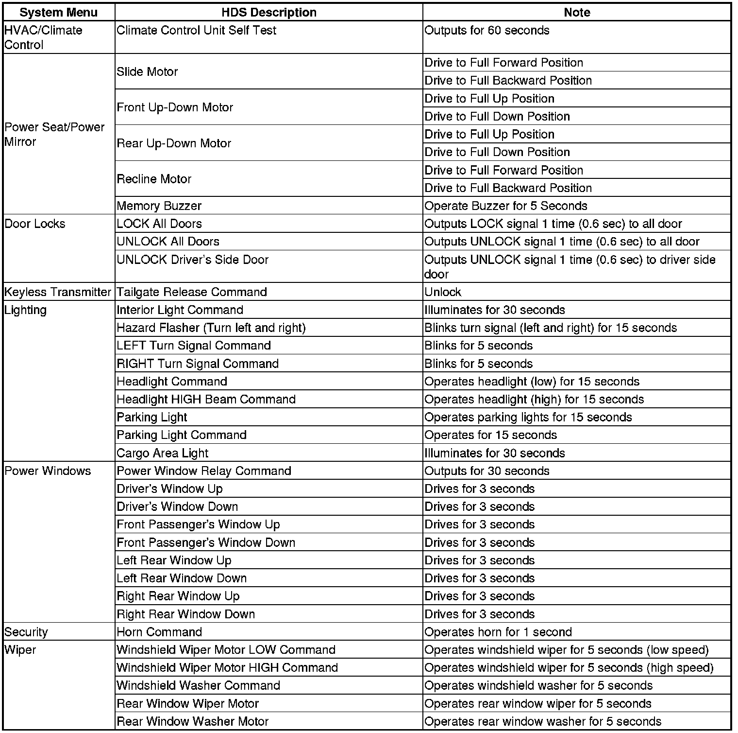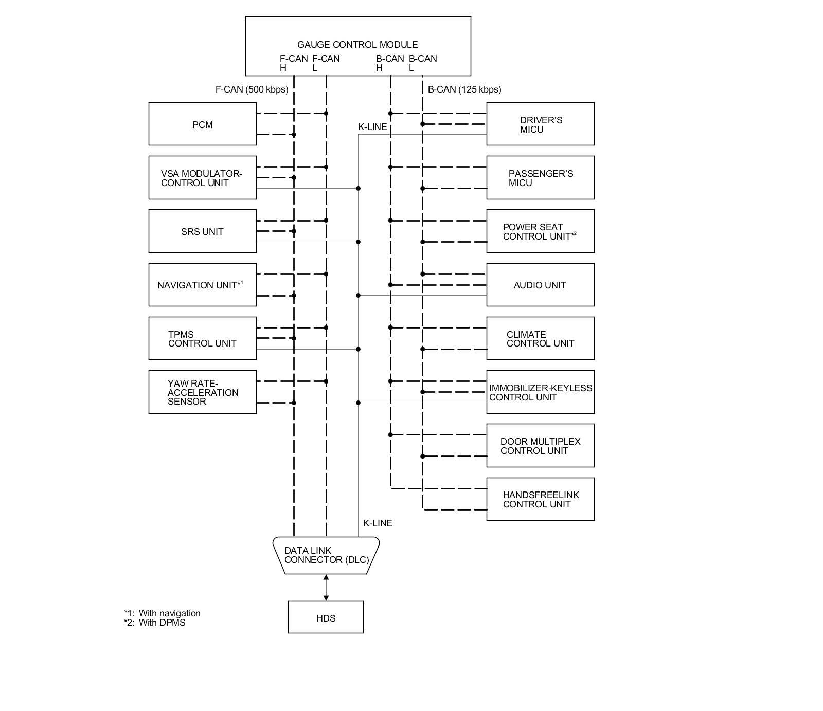 By connecting the HDS to the data link connector (DLC), the HDS can retrieve the diagnostic information from the driver's MICU via a diagnostic line called the K-LINE. The K-LINE is a separate communication line from the CAN lines, and is connected to most of the CAN related ECUs. The driver's MICU is a gateway between the HDS and B-CAN related ECUs, and sends B-CAN diagnostic information to the HDS. When doing a function test with the HDS, the HDS sends an output signal through the K-LINE to the driver's MICU. The driver's MICU either relays the request to another ECU, or commands the function itself.