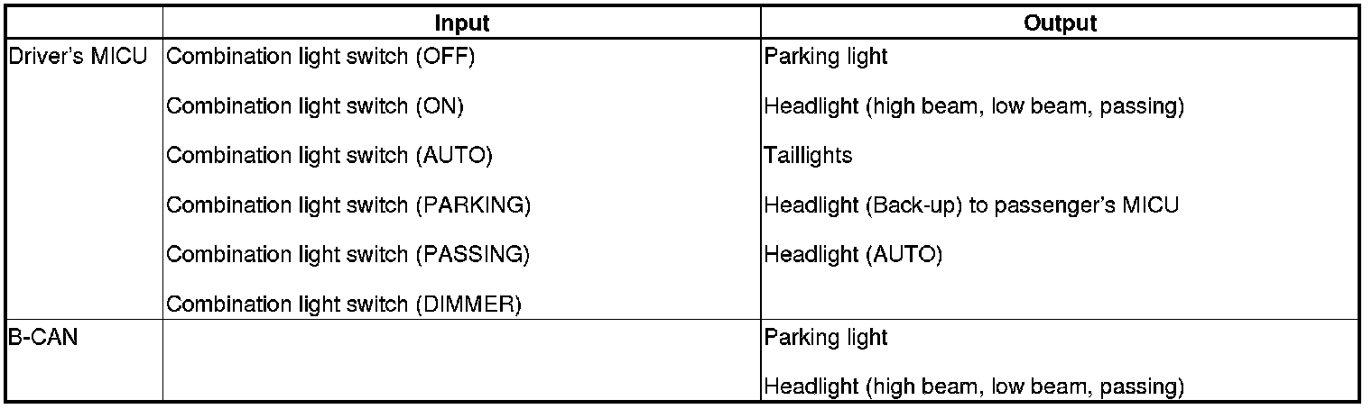 The driver's MICU controls the lighting system based on inputs from each combination light switch.