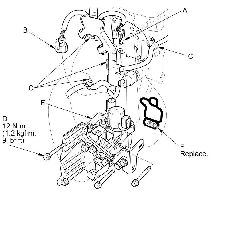 4. Remove the rocker arm oil control valve assembly (E) and the rocker arm oil control valve filter (F).
