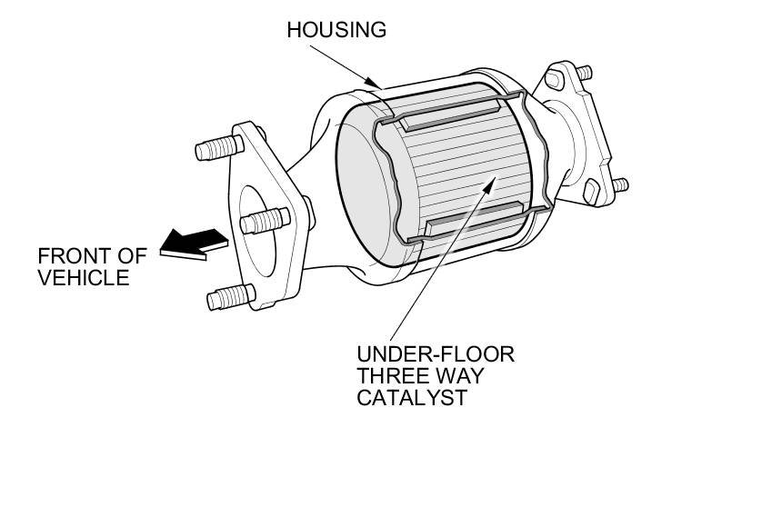 The WU-TWC/Under-Floor TWC converts hydrocarbons (HC), carbon monoxide (CO), and oxides of nitrogen (NOx) in the exhaust gas to carbon dioxide (CO2), nitrogen (N2), and water vapor.