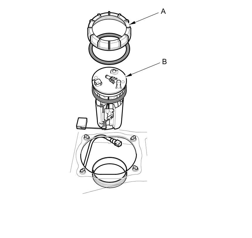 7. Remove the locknut (A) and the fuel tank unit (B).
