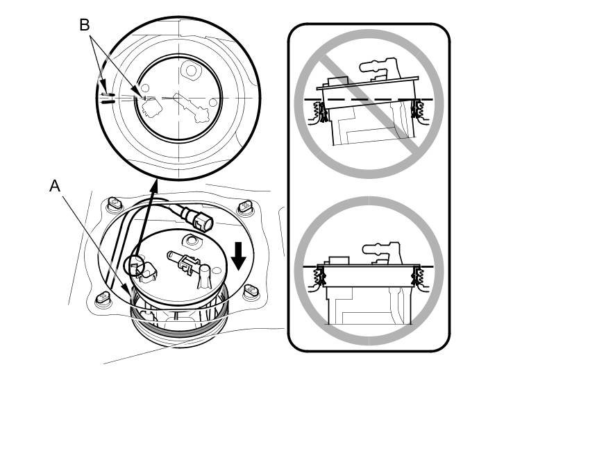 1. Temporarily attach a new base gasket (A) to the fuel tank unit (B), then insert the fuel tank unit partially into the fuel tank.