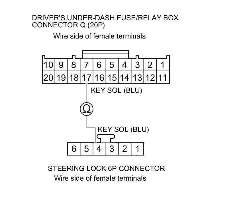 12. Check for continuity between driver's under-dash fuse/relay box connector Q (20P) terminal No. 17 and steering lock 6P connector terminal No. 4.