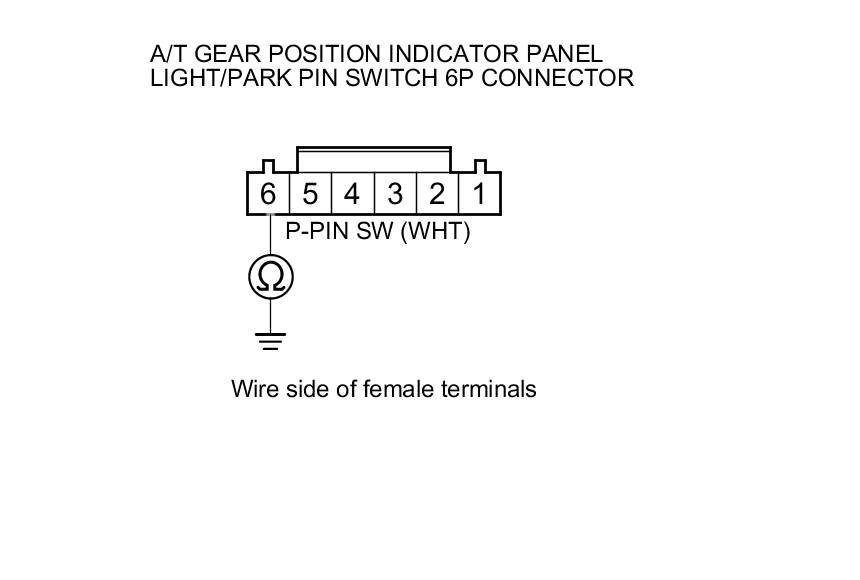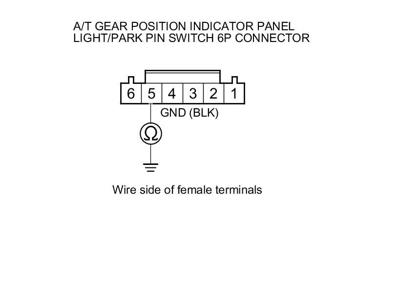 17. Check for continuity between A/T gear position indicator panel light/park pin switch 6P connector terminal No. 6 and body ground.