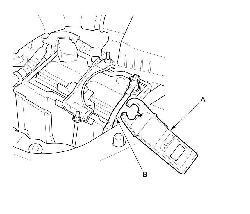 10. Attach the LH41 AC/DC low current clamp meter (A) to the battery ground cable (B). Follow the equipment manufacturer's instructions, then measure the parasitic draw.