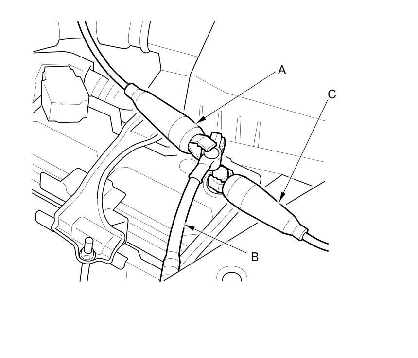 14. Slide the negative terminal of the battery ground cable upwards from the battery negative terminal so that it still makes contact and avoids disconnection. Then connect the black (-) test lead (C) to the battery negative terminal post.