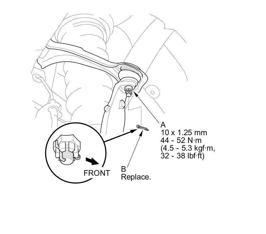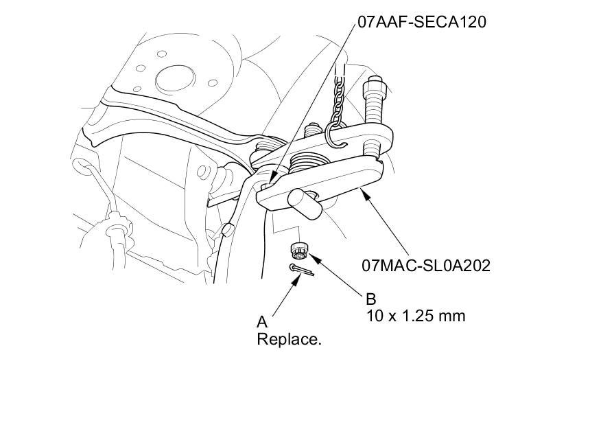 - Insert the new cotter pin (B) into the ball joint pin hole from the front to the rear of the vehicle, and bend its end as shown. Check the ball joint pin hole direction before connecting the ball joint.