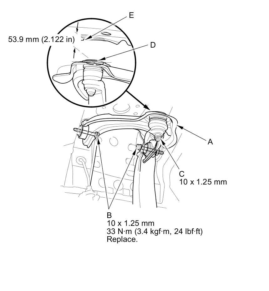 8. Place a floor jack under the lower arm, and raise the suspension until the clearance between the top (D) of the upper arm ball joint and the backside of the fender cut out point (E) is 53.9 mm (2.122 in), then tighten the upper arm mounting bolts to the specified torque.