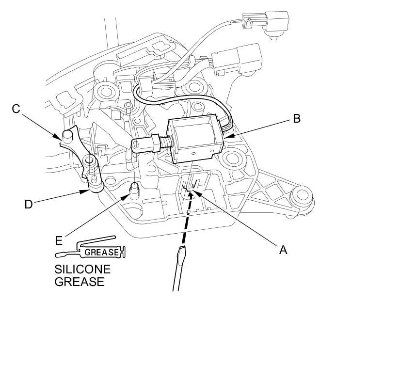 6. Apply silicone grease to the pin (E) of the shift lever bracket, then install the shift lock stop over the pin.
