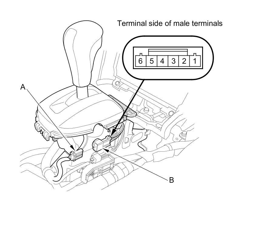 2. Disconnect the park pin switch/A/T gear position indicator panel light 6P connector (A) from the park pin switch (B).
