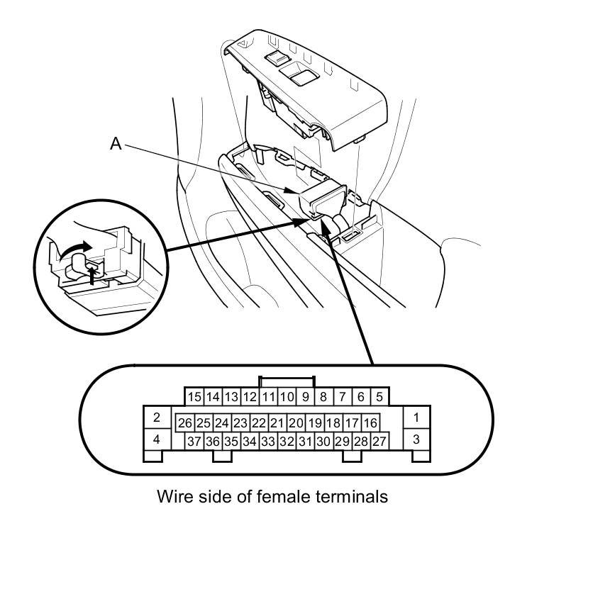 2. Test the motor in each direction by connecting battery power and ground to the front passenger's power window switch 37P connector (A) according to the table.