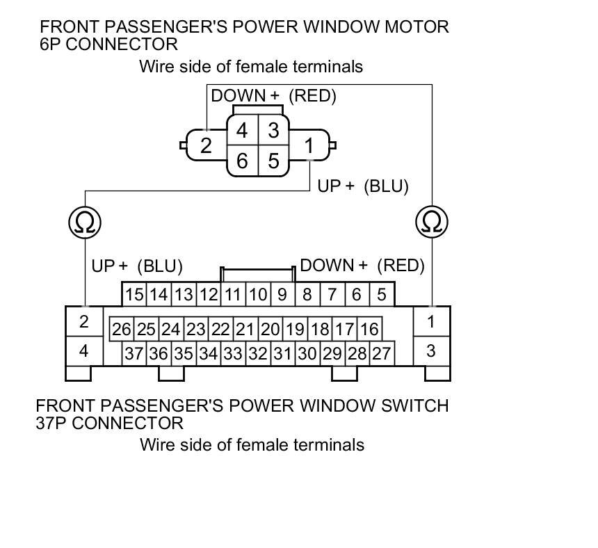 6. Check for continuity between the front passenger's power window switch 37P connector terminals and front passenger's power window motor 6P connector terminals as shown. There should be continuity.